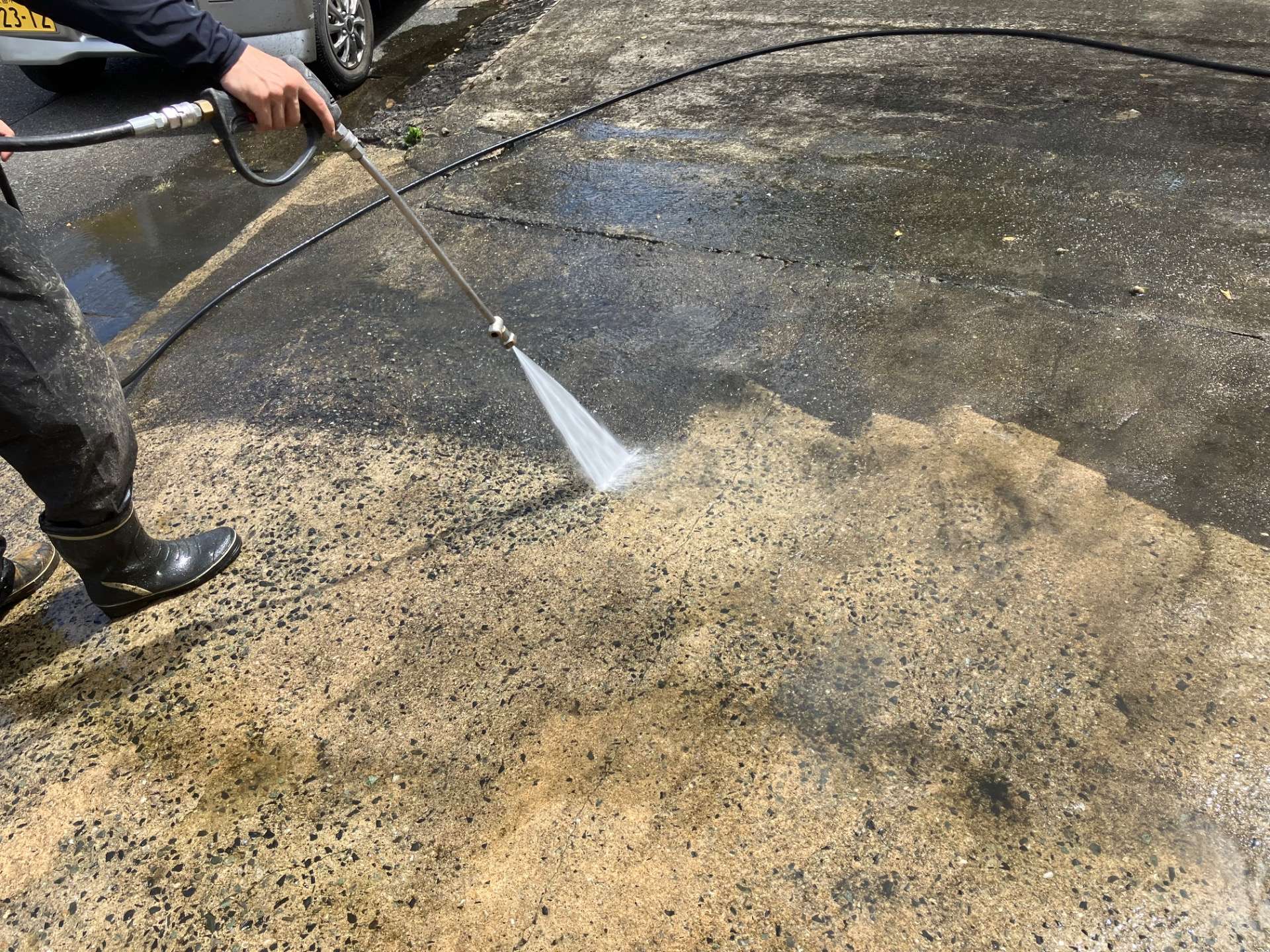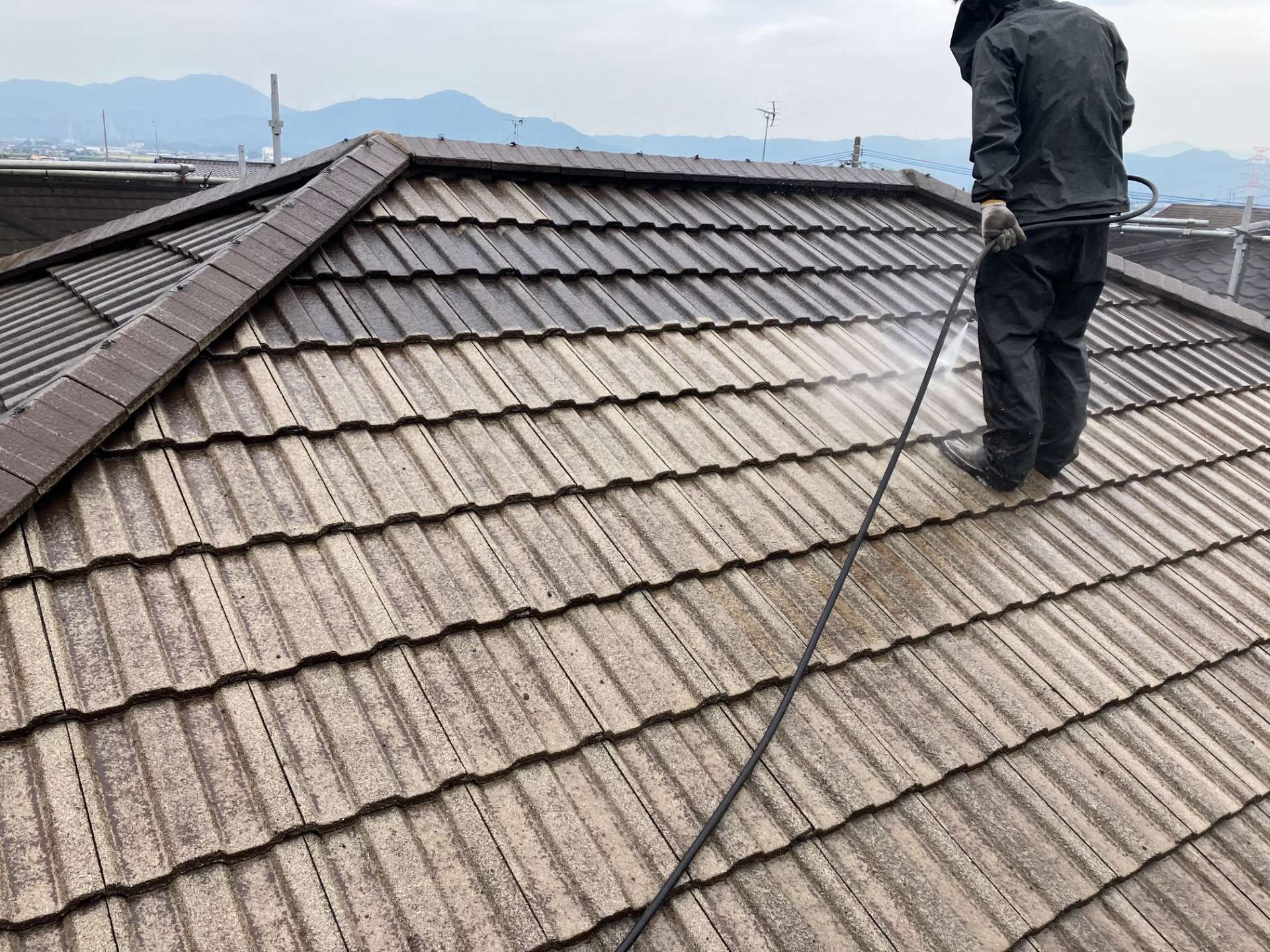 外塀高圧洗浄【小郡市 EN-BRIDGE(株)】 小郡市にて塗装工事に伴い、屋根外壁および外塀の高圧洗浄を行いました。塗装を行わない部分も高圧洗浄により長年の苔や汚れを落とすことでキレイな状態に戻す事が出来ます。